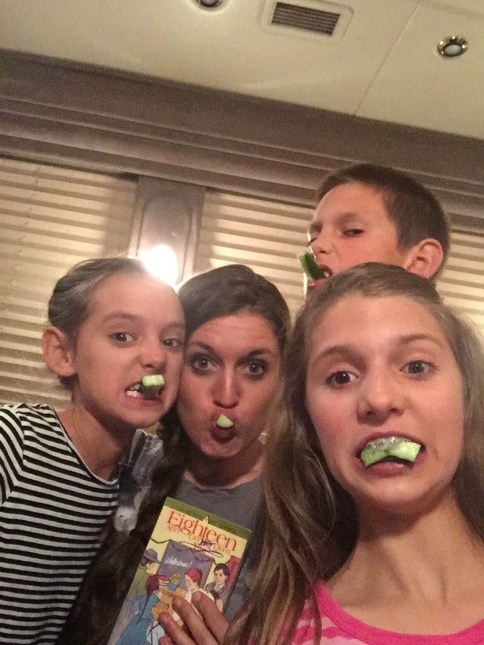 This is the “after-concert bus crew”, consisting of Allison and the three youngest. She always takes them out, presumably put them to bed, but in reality to eat fun foods (or cucumbers:) and read stories.