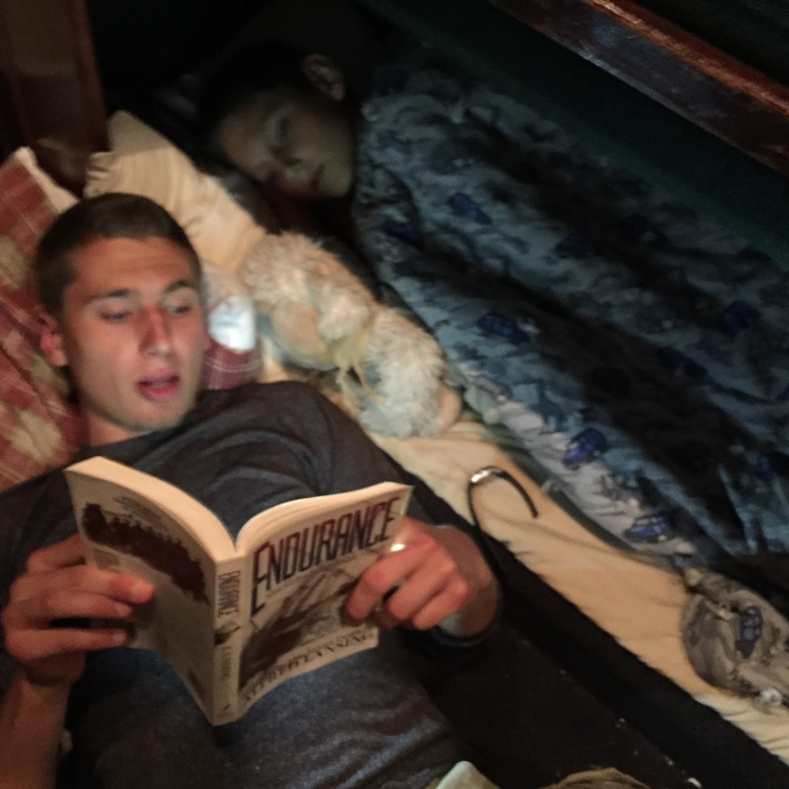 Yes, this picture is fuzzy + bad quality…but the story behind it is too sweet not to post. Poor Hudson was “down under” for a few days with a stomach bug, and one afternoon I found Mitchell laying in the hallway next to Hudsons bunk, reading to him for variation and to help pass the time for him.