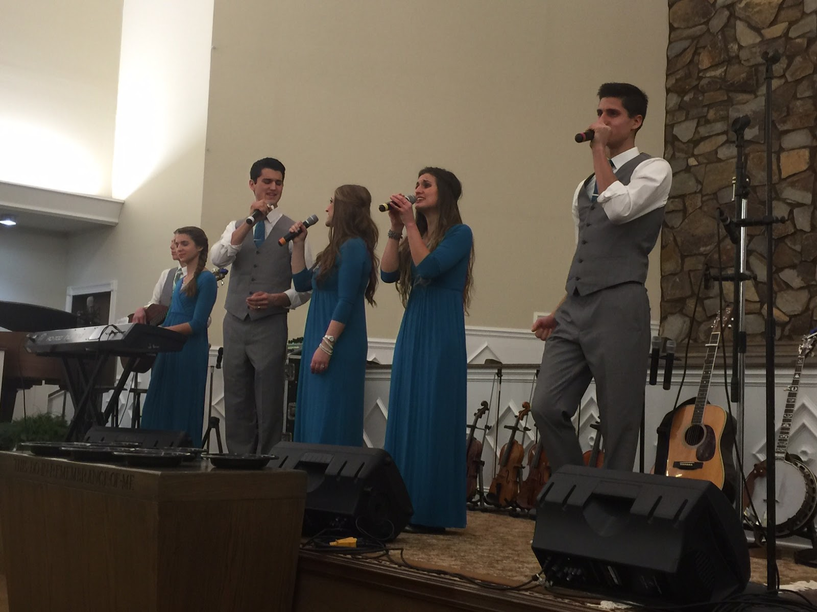 “How Can I Keep From Singing Your Praise?”: Hudson on bass, Liz on piano, Joshua singing tenor, Cassidy singing alto, Allison singing lead, and Denver singing bass.