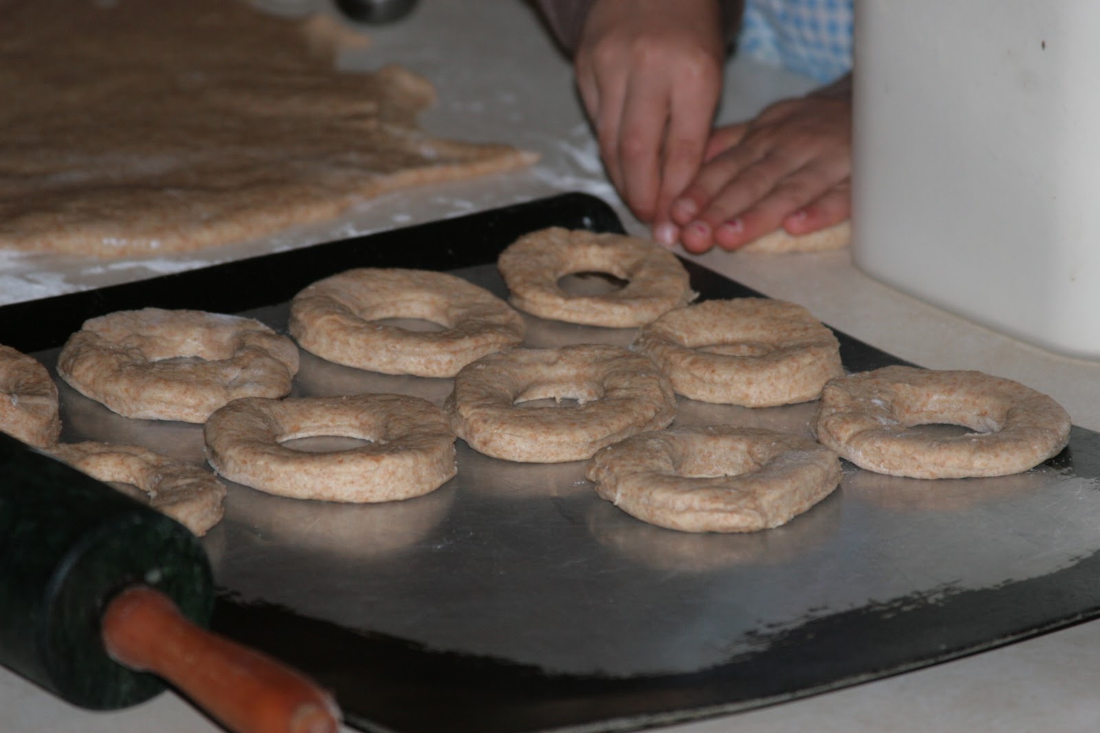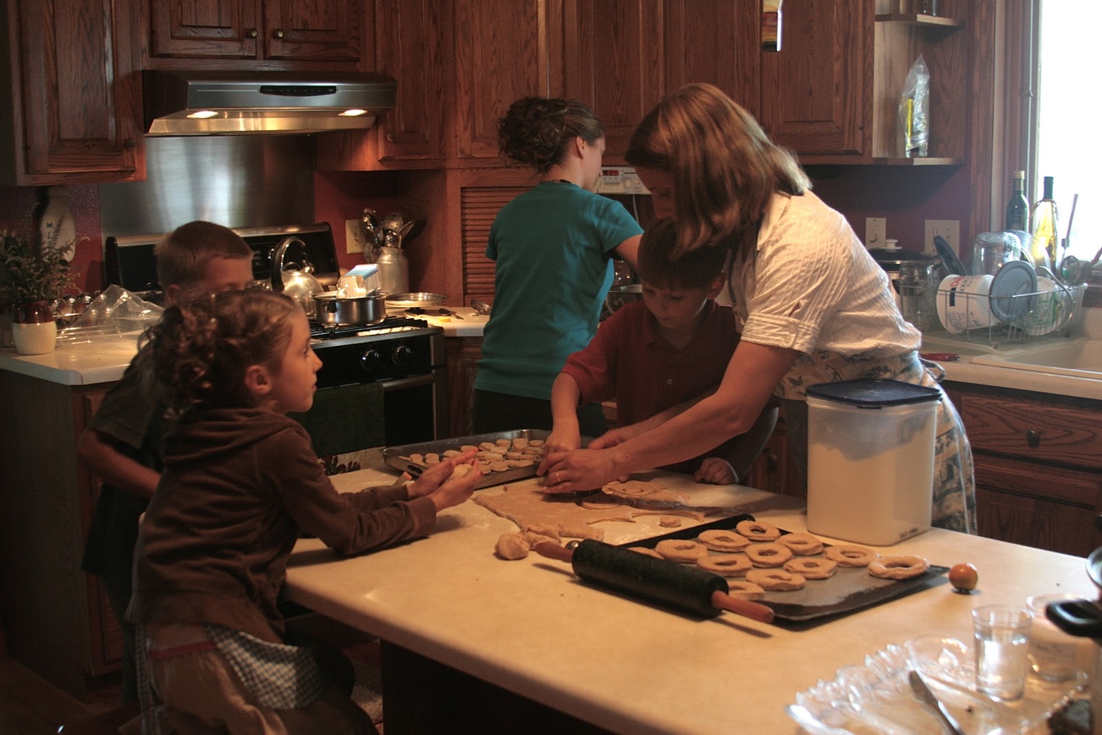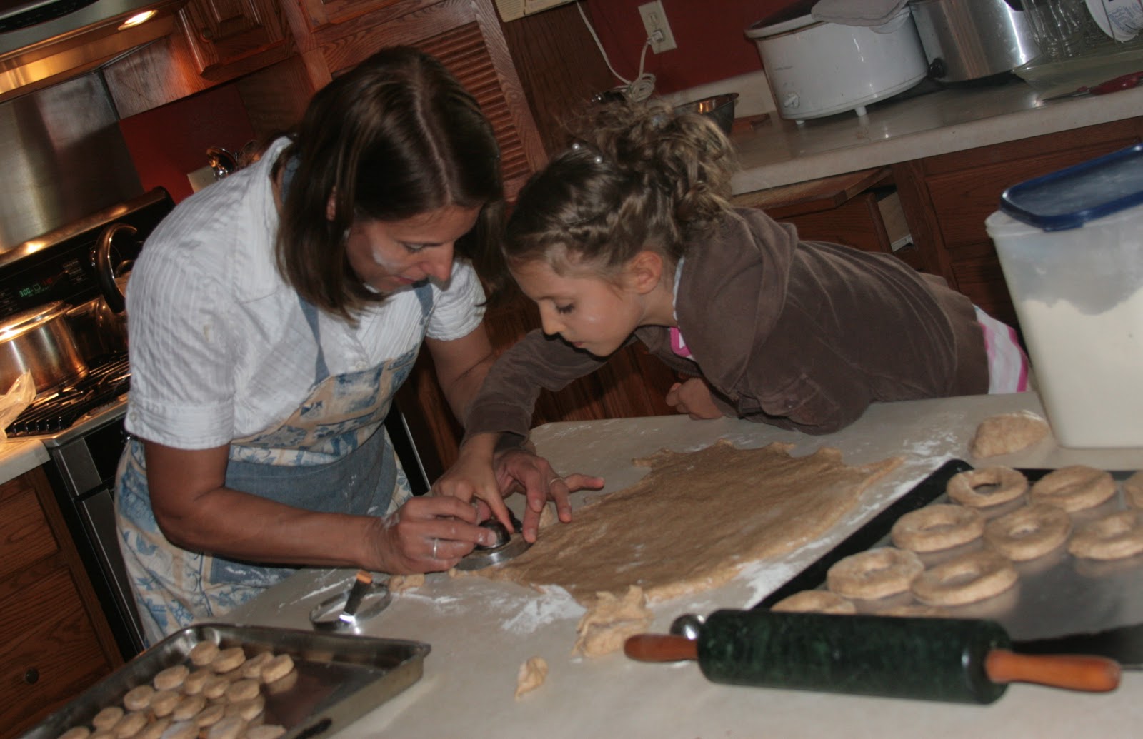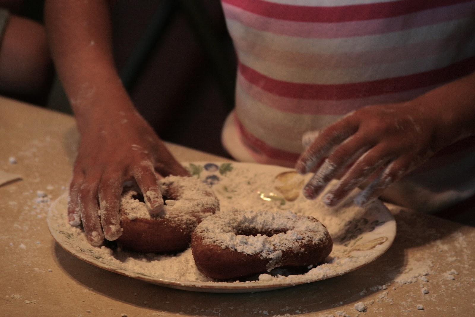 Here are some pictures of “doughnut-making day.” It was such fun……..that “hissing and bubbling” when you drop the doughnuts into the scalding hot oil, the powdered sugar all over the kitchen, the discussions about why the doughnuts are too dark and if the oil is too hot or not hot enough, the reminders from Mother to “not lick your fingers” while you roll the doughnuts in powdered sugar, the delicious taste of a fresh and hot doughnut with a cup of milk, the fun of sharing the finished products with others, the utterly “fried” (like MacDonalds?) smell you are left with……………..it all combines for wonderful memories!